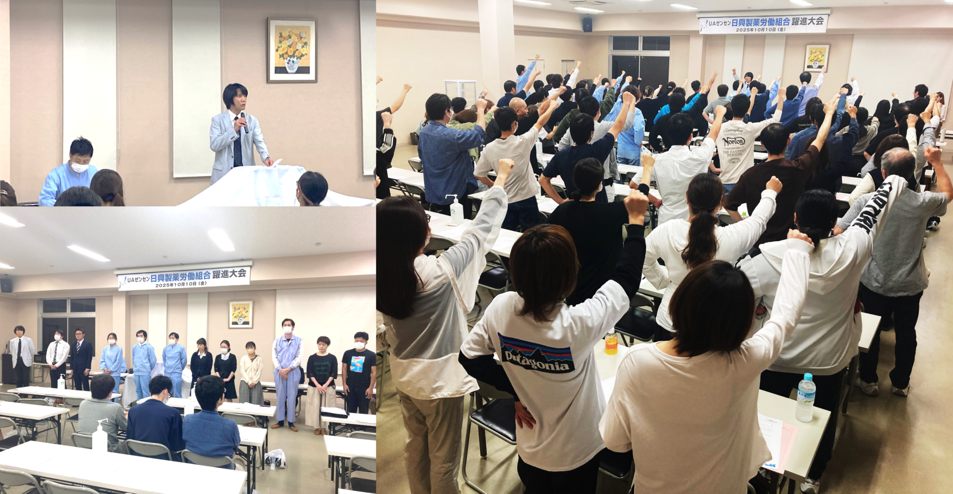 2025年10月10日(金)、UAゼンセン日興製薬労働組合の躍進大会が100名を超える出席者のもと、UAゼンセンから田中あさ子岐阜県支部長、会社から日置惠子代表取締役会長、伊藤忠弘代表取締役社長を来賓に迎え、盛大に開催されました。