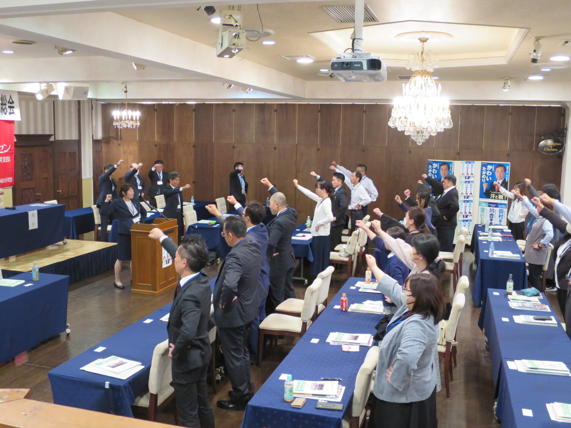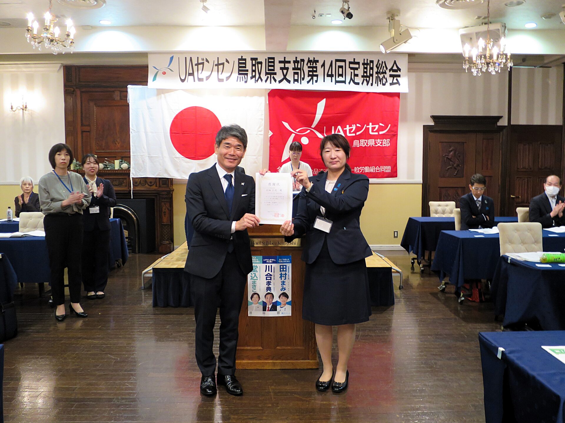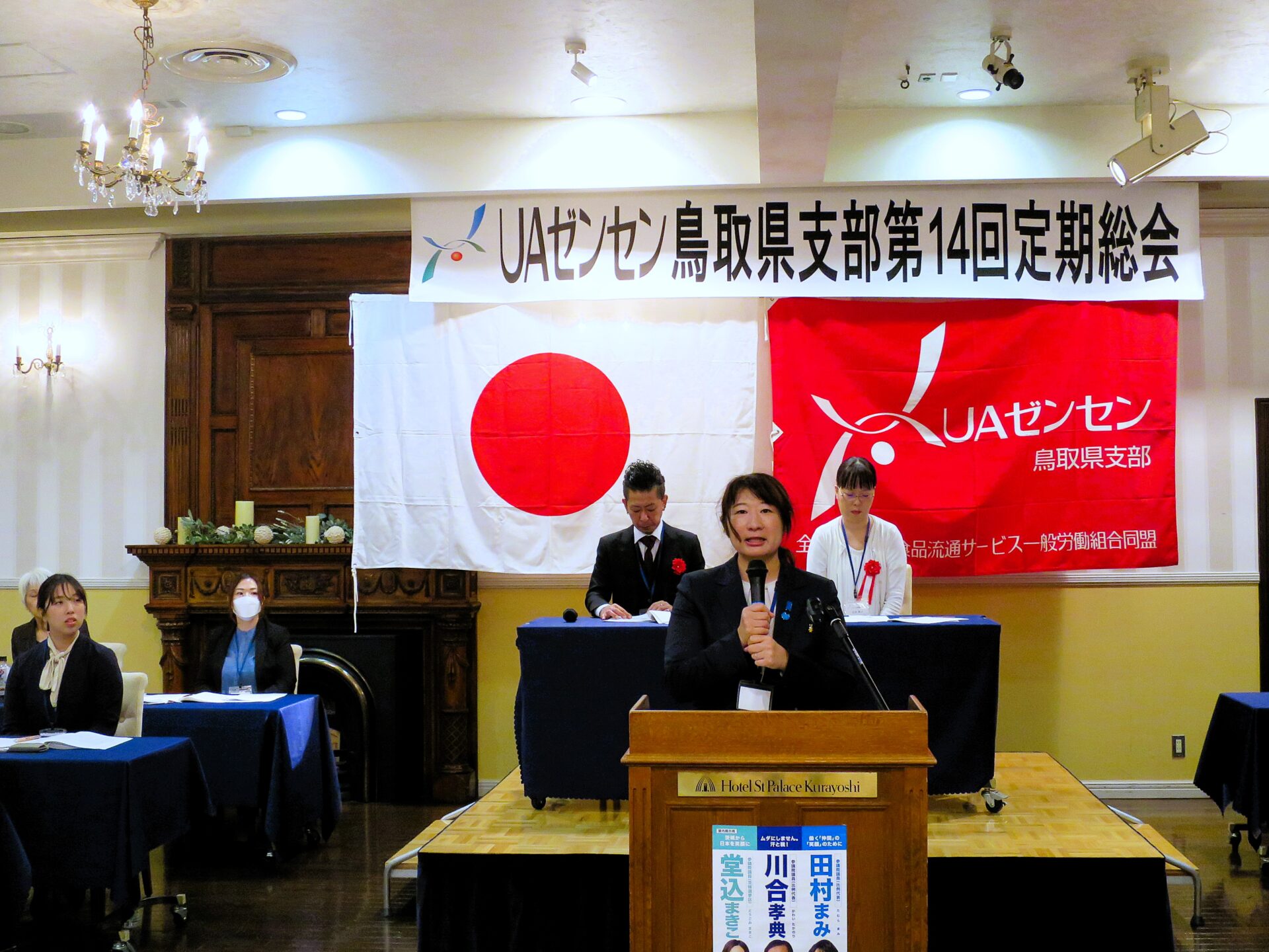 2025年10月19日(日)、ホテルセントパレス倉吉にて代議員25名、役員14名、来賓8名の総勢47名が出席し、鳥取県支部「第14回定期総会」を開催しました。福安議長(グッドヒル労働組合)、石井議長(トリーカ労働組合)の二人によるスムーズな議事進行のもと、2026年度活動計画を含む4議案全てが満場一致にて可決されました。