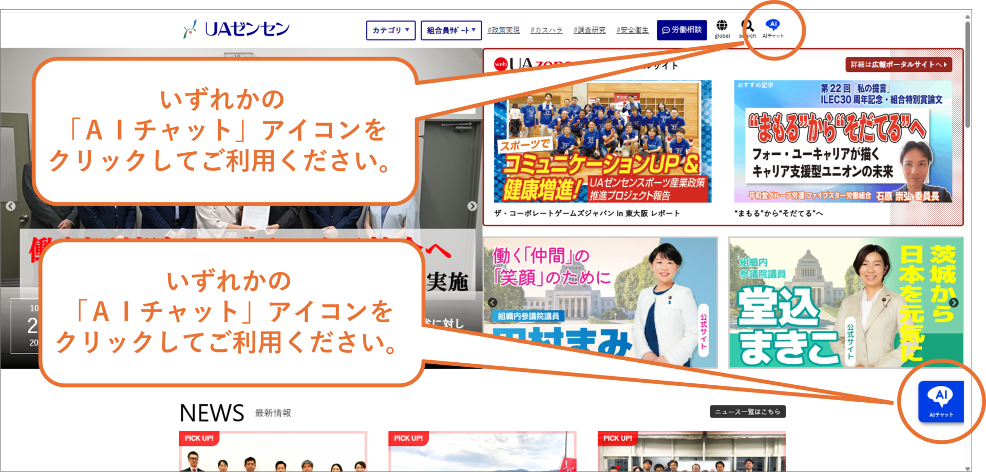 この度、ユーザビリティを向上させるべく、ホームページ内に「AIチャット機能」を実装いたしました。ユーザーの皆様からの検索や質問を生成AIが判断し、UAゼンセンホームページ内の掲載情報をもとに回答を表示します。UAゼンセンの諸活動に関する検索や質問などにお気軽にご活用いただければ幸いです。