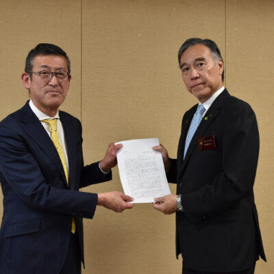 川合参議院議員、堂込参議院議員同席のもと、関係省庁に直塚製造産業部門長(中央右)から調査報告書を提出
