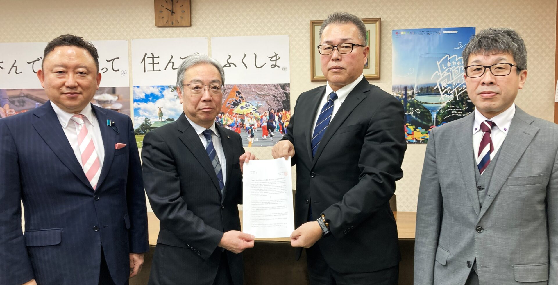 要請書の手交(左より大場県議、佐藤副知事、井上支部長、本多運営評議会議長)