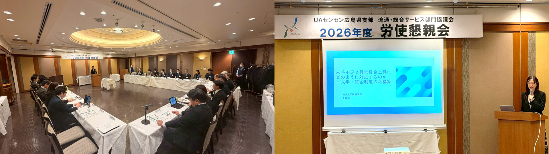 2026年2月4日(水)に広島県支部の流通・総合サービス部門協議会主催「2026年度労使懇談会」を開催しました。労使で各種制度や取り組みについて情報交換を行い、その後、埼玉大学経済学部の金井郁教授より基調講演をいただきました。