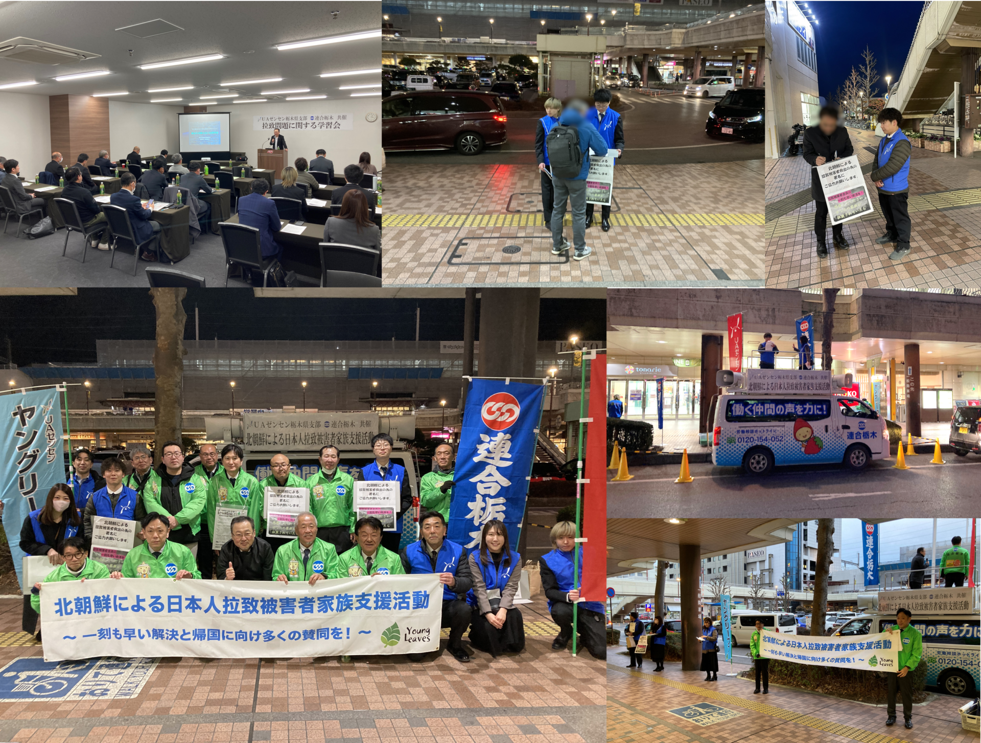 拉致問題への理解を深める学習会の様子(上段左)、JR宇都宮駅西口での街頭活動の様子