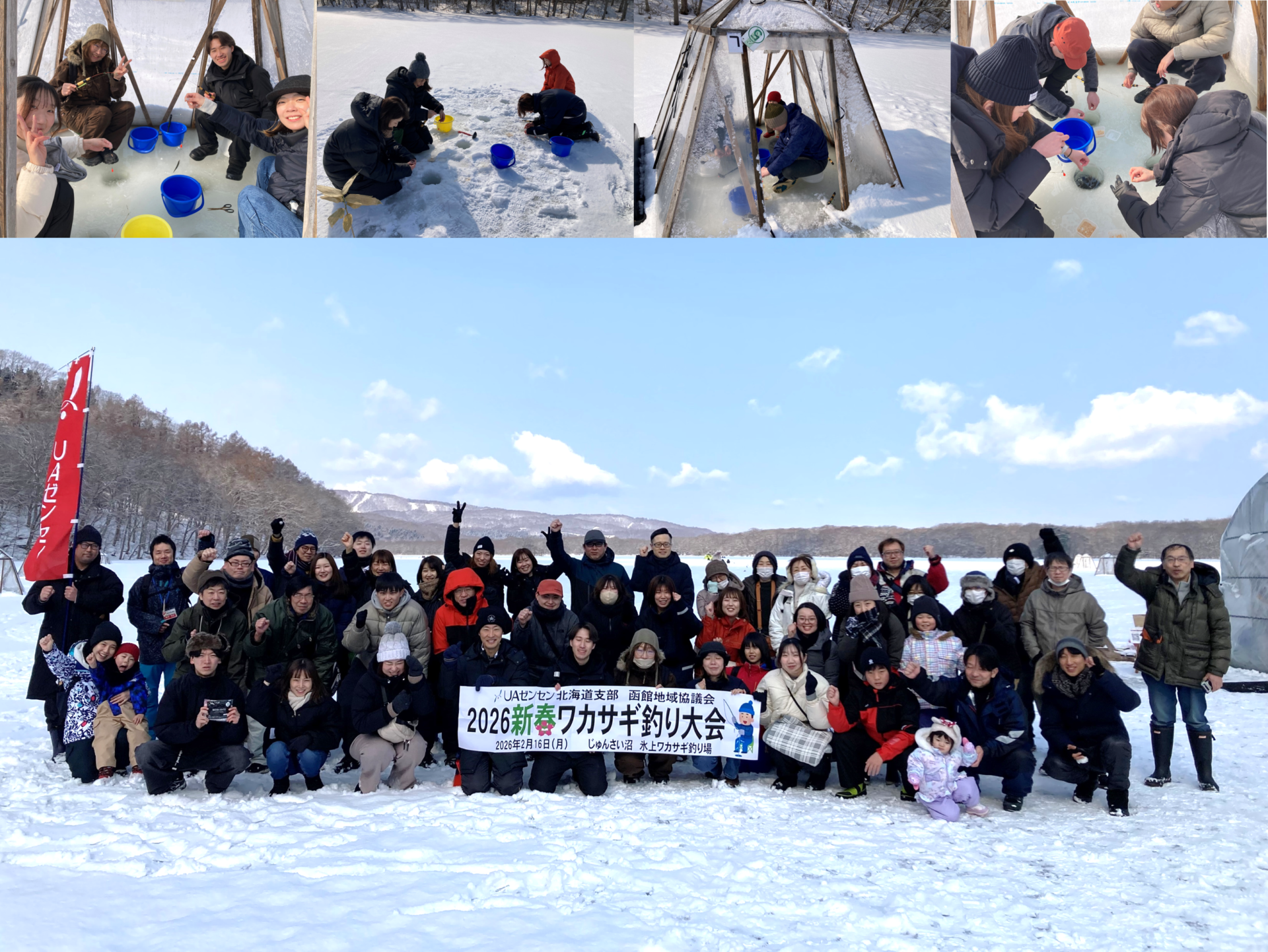 北海道支部・函館地域協議会は2026年2月16日(月)、昨年度に続き「2026新春ワカサギ釣り大会」を開催しました。今年は昨年の2倍以上となる7単組より50名の仲間が参加し、晴天のもとにぎやかにスタートしました。