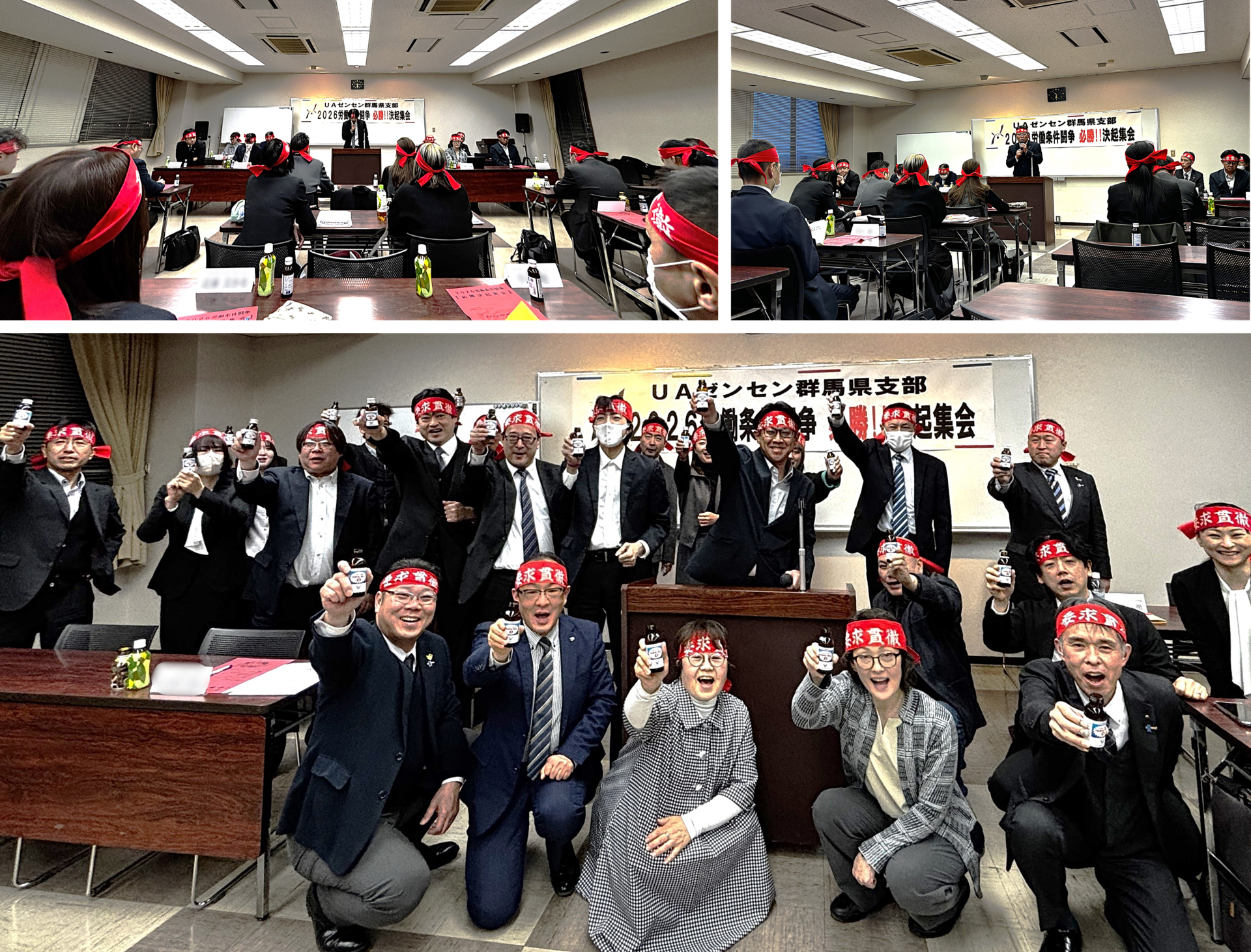 参加者全員「要求貫徹」のハチマキを巻き、最後は日東グラステックス労働組合の田島組合長を中心にリポビタンDを片手に「ファイト一発!」で締めくくり、交渉に向けて心合わせを行ないました。
