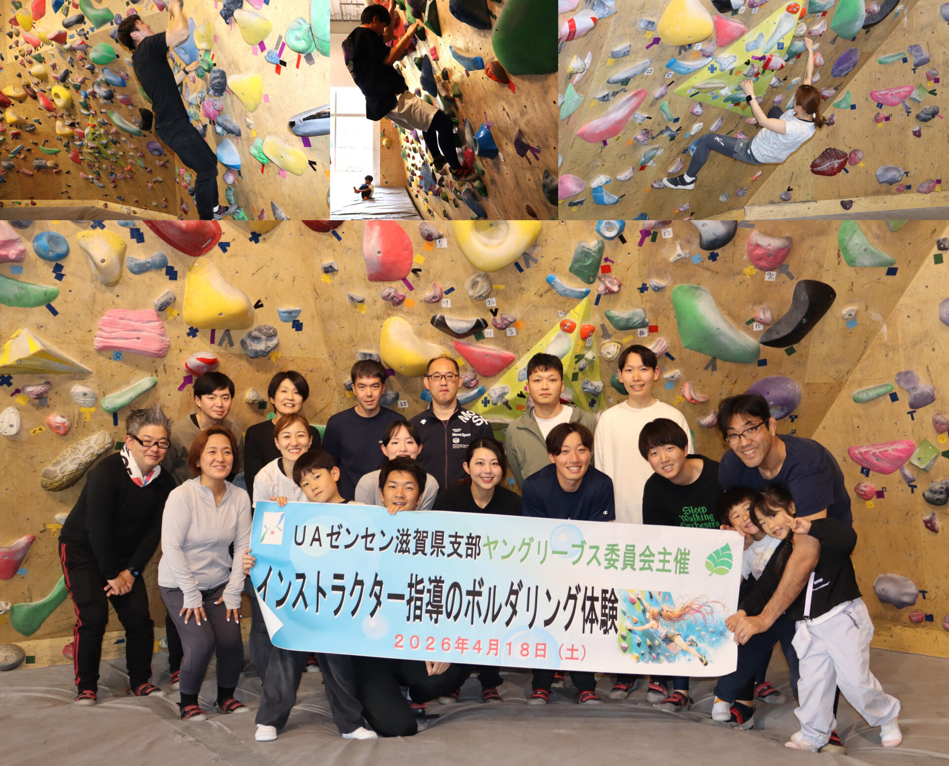 滋賀県支部は2026年4月18日、ヤングリーブス主催のボルダリングイベントを開催し、7単組より20名の仲間が参加しました。