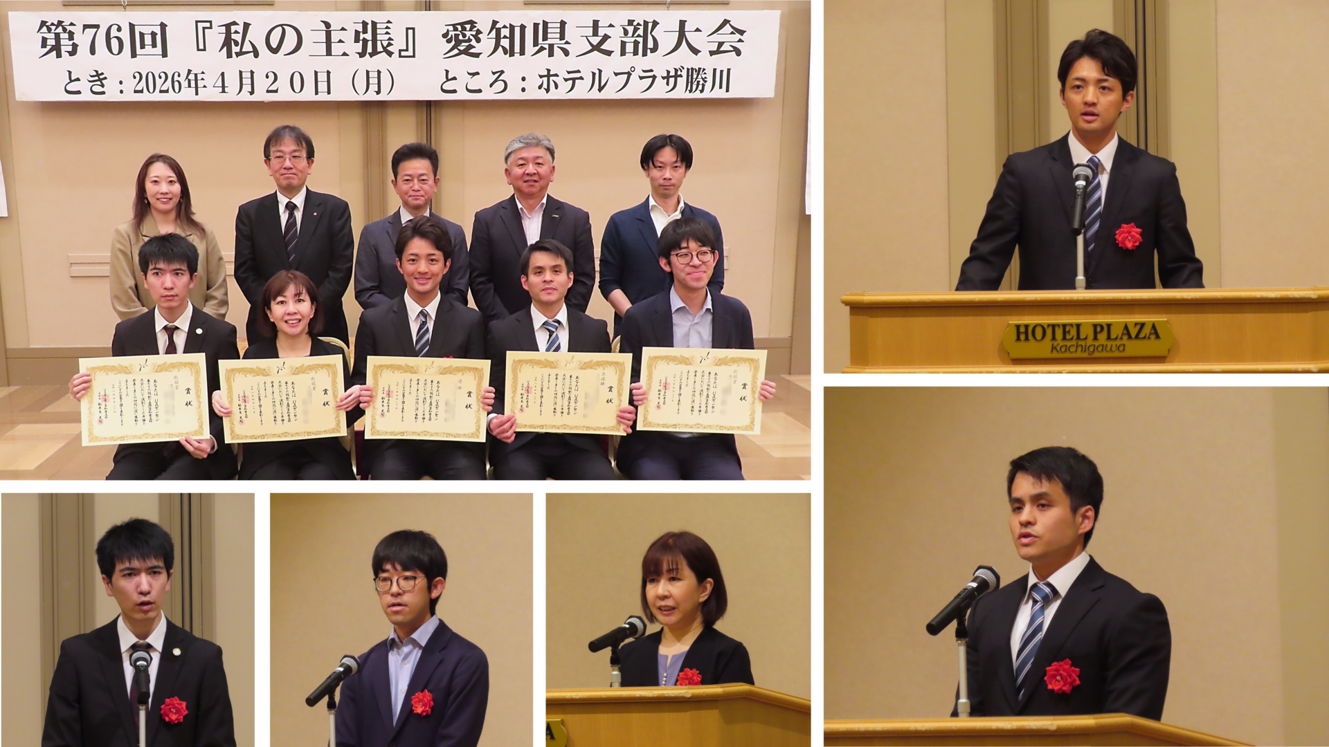 愛知県支部は、2026年4月20日、ホテルプラザ勝川において、第76回「私の主張」愛知県支部大会を開催しました。当日は5名の弁士が出場し、組合活動や自身の体験をテーマに、6分間の中で熱意あふれる弁論が繰り広げられました。