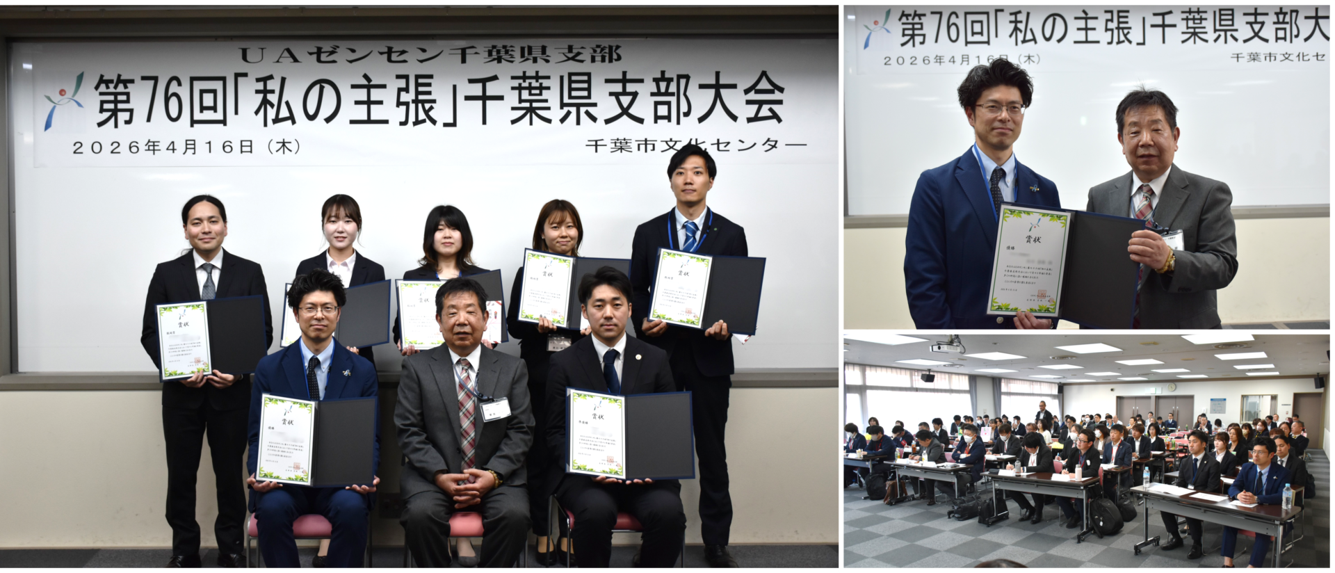 千葉県支部は2026年4月16日、千葉市文化センターにおいて、第76回「私の主張」千葉県支部大会を開催しました。今年は6組合から7名の弁士が出場し、千葉県支部の運営評議員や応援者など総勢87名が参加しました。