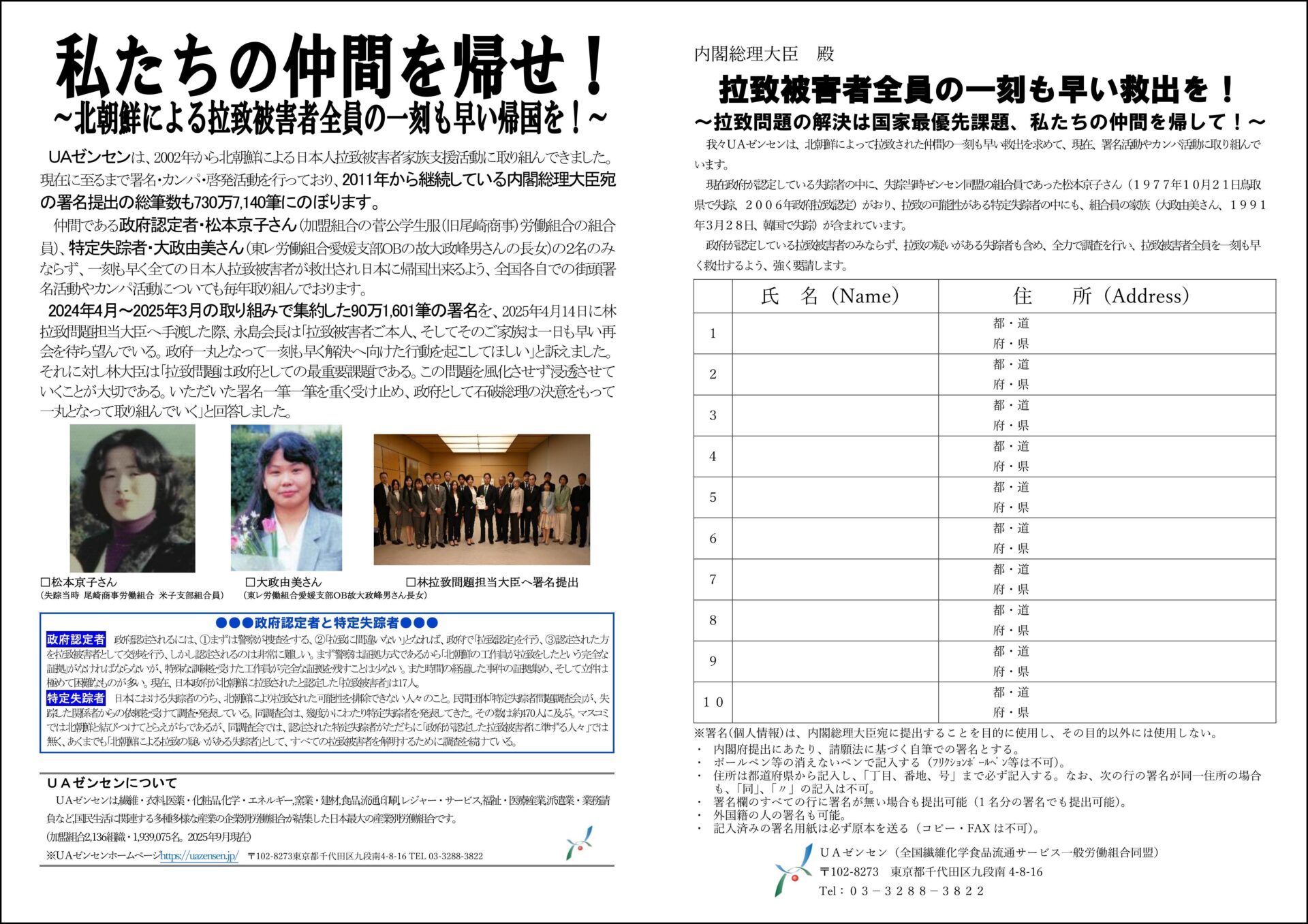 UAゼンセンは、組合員に拉致被害者がいます。1977年に鳥取県で失踪した松本京子さん(失踪当時尾崎商事労組(現 菅公学生服労組))と、拉致の可能性がある特定失踪者の大政由美さん(東レ労組愛媛支部OB故大政峰男さんの長女)の2名です。 私たちは、2名を含むすべての日本人拉致被害者が一刻も早く救出され、帰国できるよう、全国の職場や街頭で署名活動を行っています。